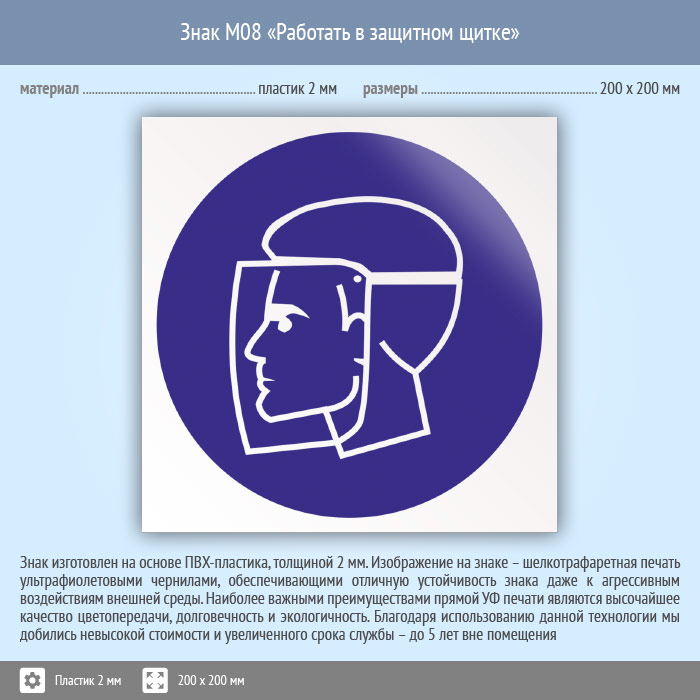 Знак M08 «Работать в защитном щитке» (пластик, 200х200 мм)