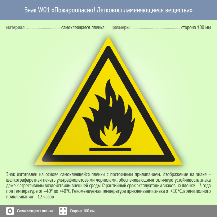 Знак W01 «Пожароопасно! легковоспламеняющиеся вещества» на пленке, размером стороны 100 мм предупреждает о том, что здесь находятся горючие, легковоспламеняющиеся вещества. Предупреждающие знаки безопасности изготовлены согласно ГОСТ Р 12.4.026-2015 и предназначены для предупреждения людей о возможной опасности
