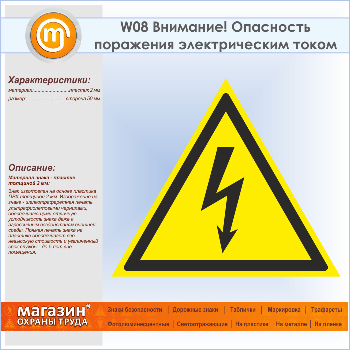 Знак W08 «Внимание! опасность поражения электрическим током» на пластике, размером стороны 50 мм предупреждает о возможном поражении электрическим током. Предупреждающие знаки безопасности изготовлены согласно ГОСТ Р 12.4.026-2015 и предназначены для предупреждения людей о возможной опасности