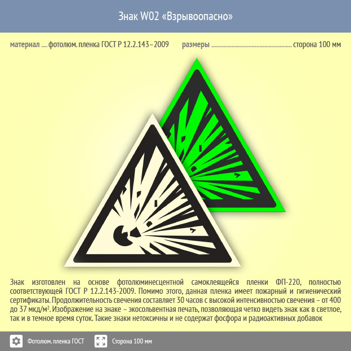Знак W02 «Взрывоопасно» на фотолюминесцентной пленке по ГОСТ 34428-2018, сторона 100 мм предупреждает о пожаро- взрывоопасности. Предупреждающие знаки безопасности изготовлены согласно ГОСТ Р 12.4.026-2015 и предназначены для предупреждения людей о возможной опасности