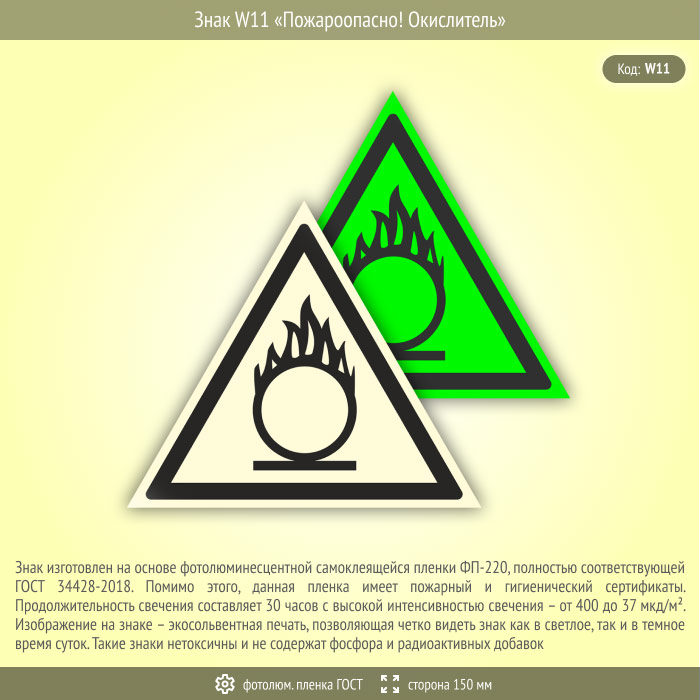 Знак W11 «Пожароопасно! окислитель» (фотолюминесцентная пленка ГОСТ 34428-2018, сторона 150 мм)