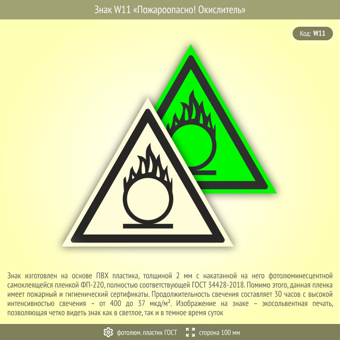 Знак W11 «Пожароопасно! Окислитель» (фотолюминесцентный пластик ГОСТ 34428-2018, сторона 100 мм)