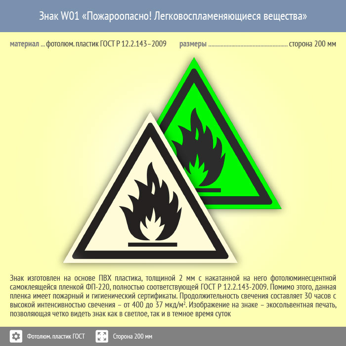 Знак W01 «Пожароопасно! Легковоспламеняющиеся вещества» на фотолюминесцентном пластике по ГОСТ 34428-2018, размером стороны 200х200 мм предупреждает о том, что здесь находятся горючие, легковоспламеняющиеся вещества. Предупреждающие знаки безопасности изготовлены согласно ГОСТ Р 12.4.026-2015 и предназначены для предупреждения людей о возможной опасности