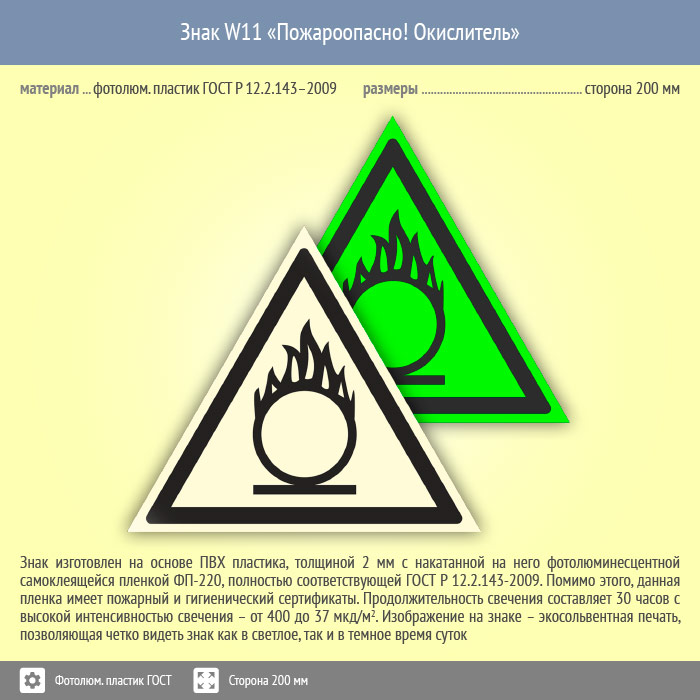 Знак W11 «Пожароопасно! Окислитель» на фотолюминесцентном пластике по ГОСТ 34428-2018, размером стороны 200х200 мм сообщает, что здесь находится окислитель и это вполне пожароопасно. Предупреждающие знаки безопасности изготовлены согласно ГОСТ Р 12.4.026-2015 и предназначены для предупреждения людей о возможной опасности