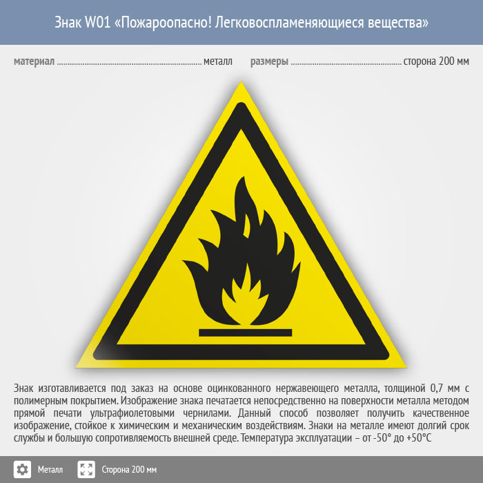 Знак W01 «Пожароопасно! легковоспламеняющиеся вещества» (металл, сторона 200 мм)