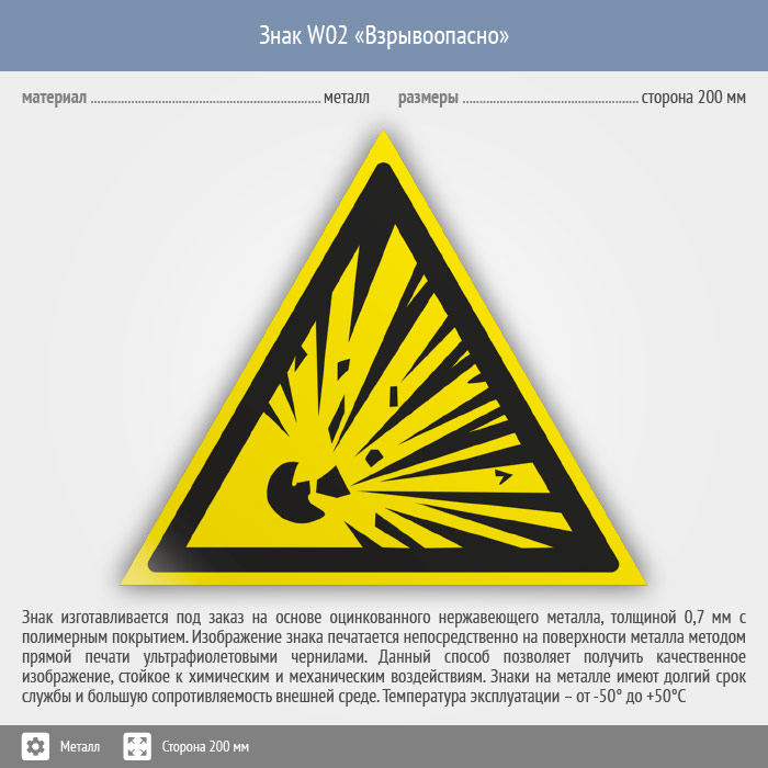 Знак W02 «Взрывоопасно» на металле, размером стороны 200 мм предупреждает о пожаро- взрывоопасности. Предупреждающие знаки безопасности изготовлены согласно ГОСТ Р 12.4.026-2015 и предназначены для предупреждения людей о возможной опасности