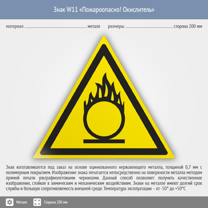 Знак W11 «Пожароопасно! окислитель» (металл, сторона 200 мм)