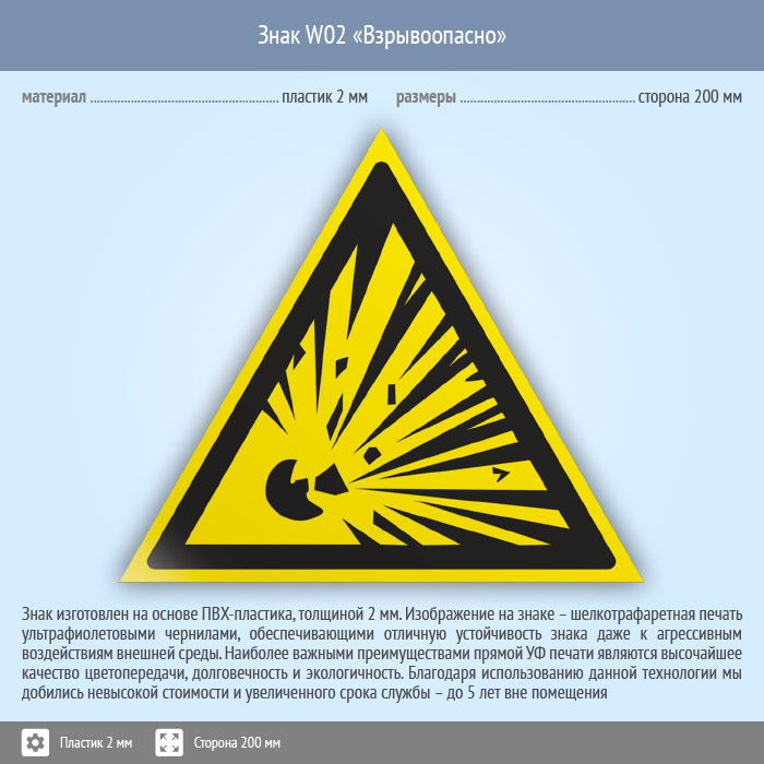 Знак W02 «Взрывоопасно» на пластике, размером стороны 200 мм предупреждает о пожаро- взрывоопасности. Предупреждающие знаки безопасности изготовлены согласно ГОСТ Р 12.4.026-2015 и предназначены для предупреждения людей о возможной опасности