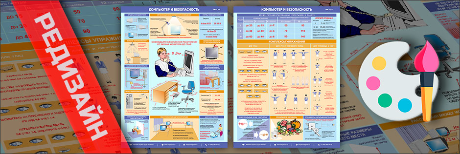 - Плакат расскажет об организации рабочего места – безопасных расстояниях, нормах освещенности, вентиляции, оборудовании