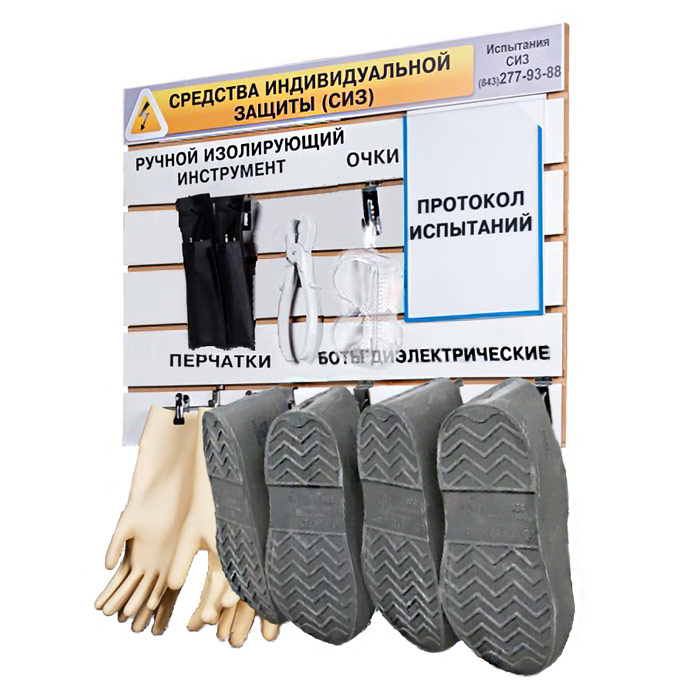 Размещение предметов защиты на специальном стенде обеспечивает оптимальные условия для сохранения свойств и характеристик диэлектрических материалов, защищая их от механических и химических воздействий, ультрафиолета, повышенной температуры и влажности. Открытый доступ позволяет легко и быстро воспользоваться средствами в случае необходимости.