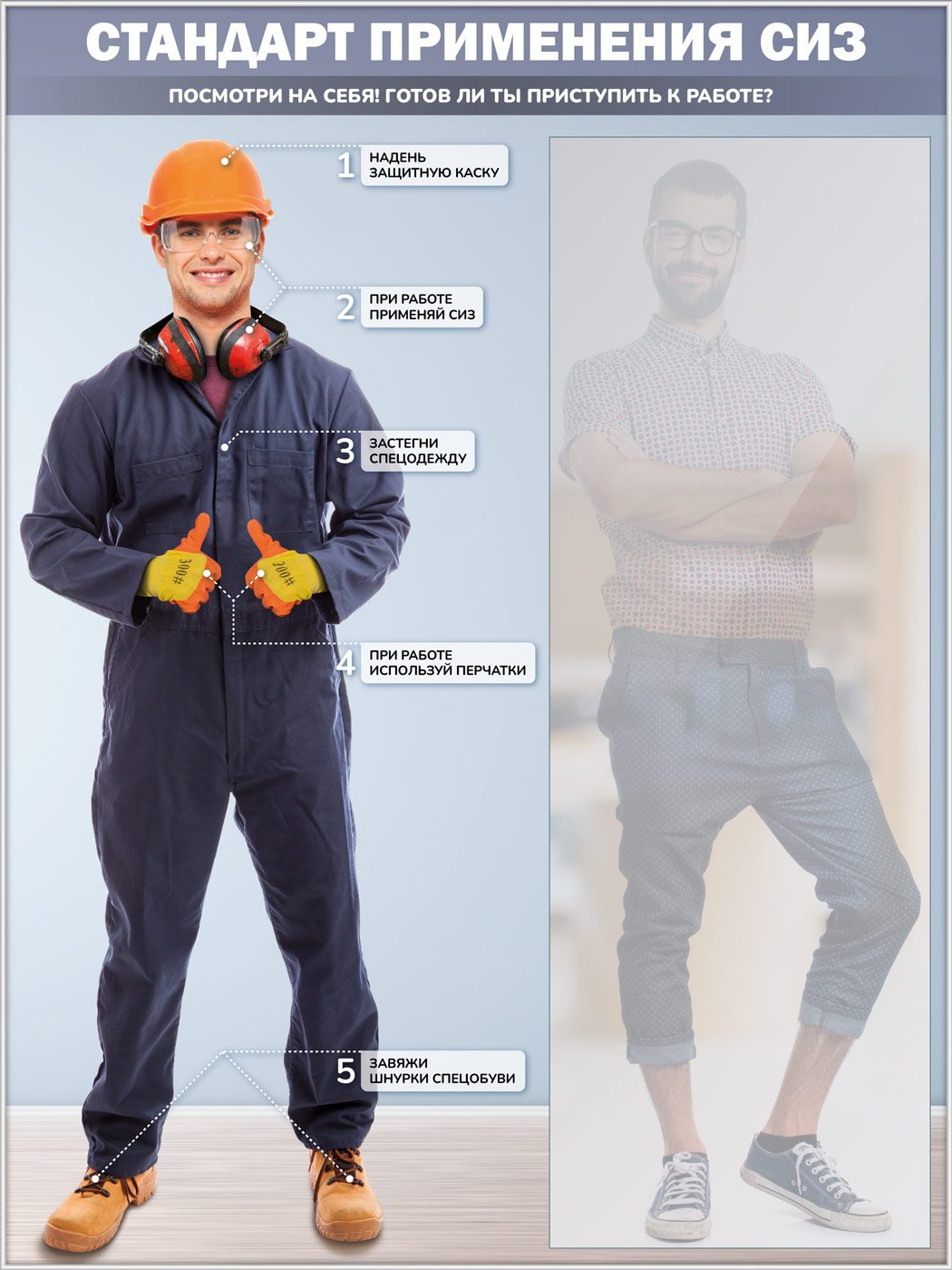 К бесплатным изменениям относятся изменение названия, шрифта и цвета заголовков, изменение текста пунктов и их шрифта, замена фона на однотонный или градиентный, а также размещение фирменного логотипа. Если же на стенде нужно использовать другого персонажа с другим комплектом спецодежды - то цена увеличивается на 4'900₽ за макет