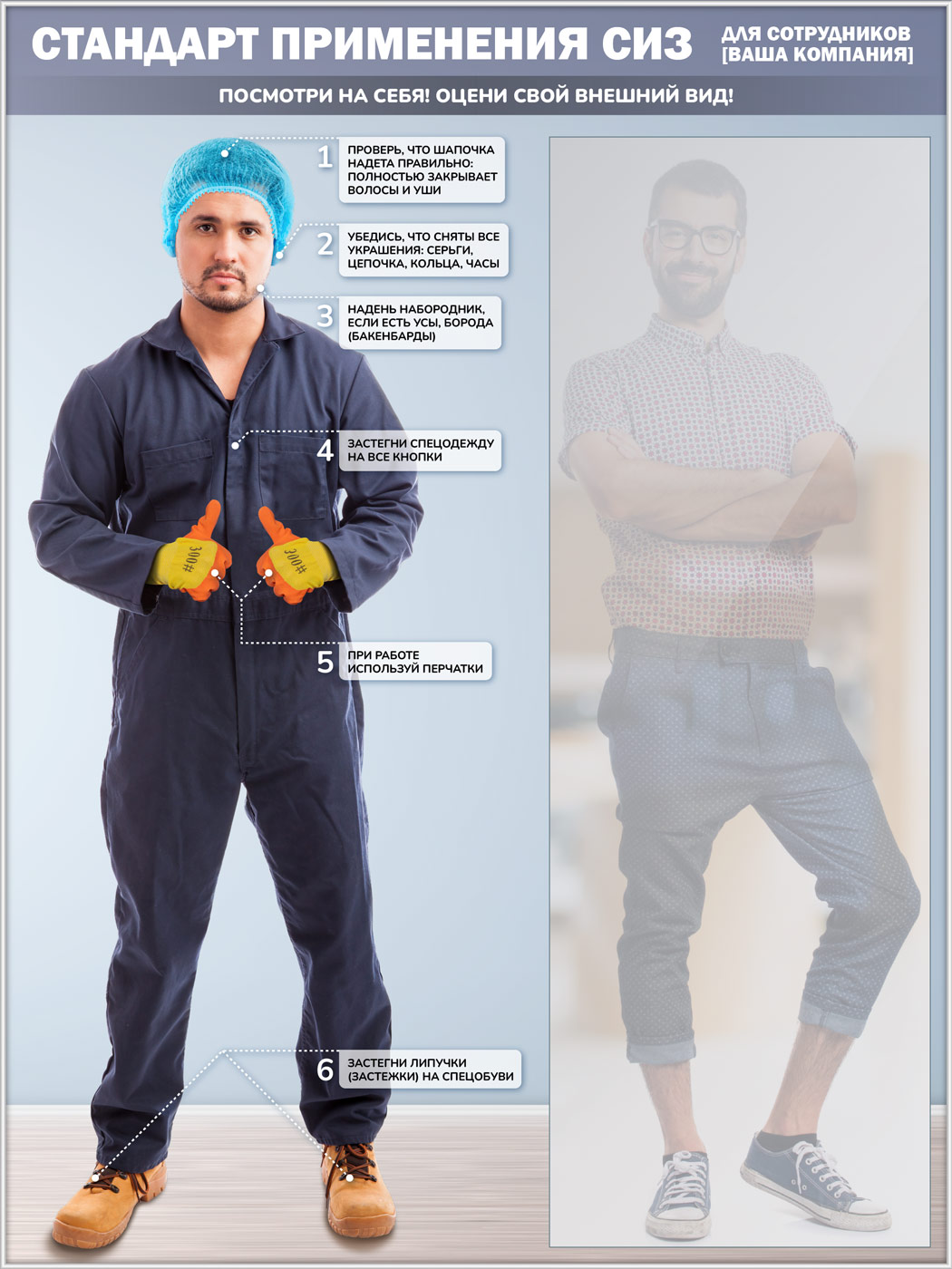 К бесплатным изменениям относятся изменение названия, шрифта и цвета заголовков, изменение текста пунктов и их шрифта, замена фона на однотонный или градиентный, а также размещение фирменного логотипа. Если же на стенде нужно использовать другого персонажа с другим комплектом спецодежды - то цена увеличивается на 4'900₽ за макет