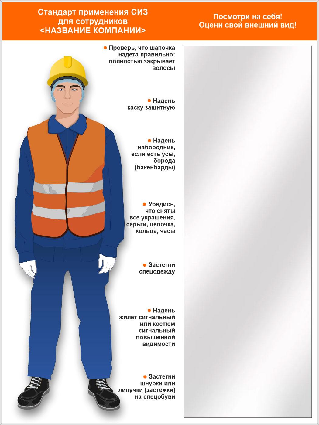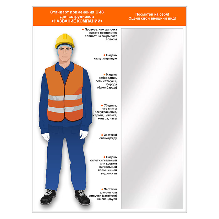 Стенд для демонстрации применения СИЗ с зеркалом, 1500х2000 мм в серебряном багете (СПС-02.2-С). Стенды с примером необходимой спецодежды и комплекта СИЗ укомплектованные зеркалом - отличное решение, позволяющее работнику быстро оценить свой вид на предмет соответствия требованиям безопасной работы в цехе, на стройплощадке и др. местах