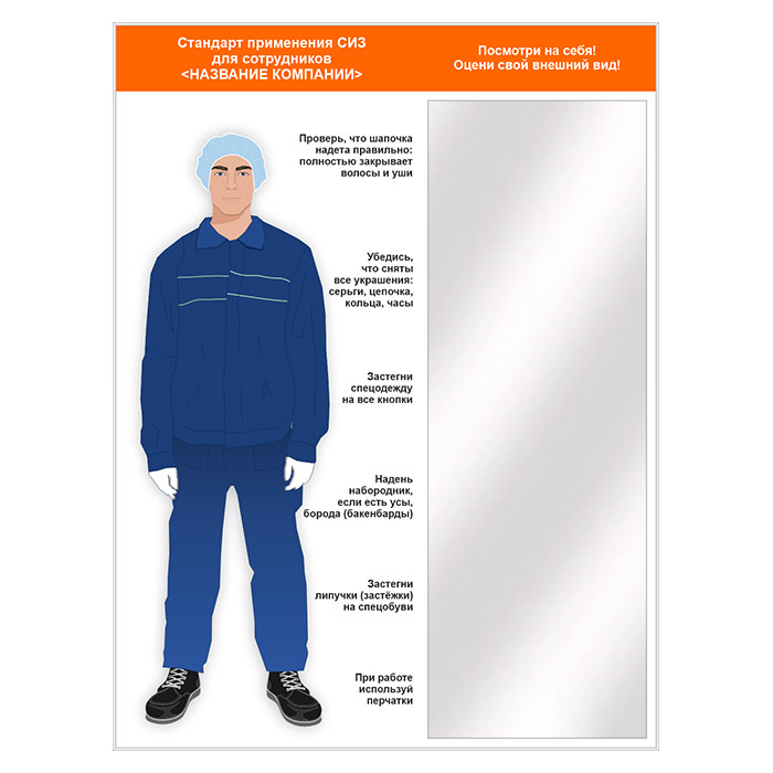 Стенд для демонстрации применения СИЗ с зеркалом, 1500х2000 мм в серебряном багете (СПС-03.2-С). Стенды с примером необходимой спецодежды и комплекта СИЗ укомплектованные зеркалом - отличное решение, позволяющее работнику быстро оценить свой вид на предмет соответствия требованиям безопасной работы в цехе, на стройплощадке и др. местах