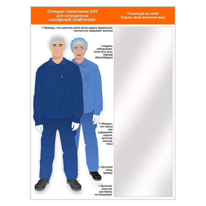 Стенд для демонстрации применения СИЗ с зеркалом, 1500х2000 мм в серебряном багете (СПС-04.2-С). Стенды с примером необходимой спецодежды и комплекта СИЗ укомплектованные зеркалом - отличное решение, позволяющее работнику быстро оценить свой вид на предмет соответствия требованиям безопасной работы в цехе, на стройплощадке и др. местах