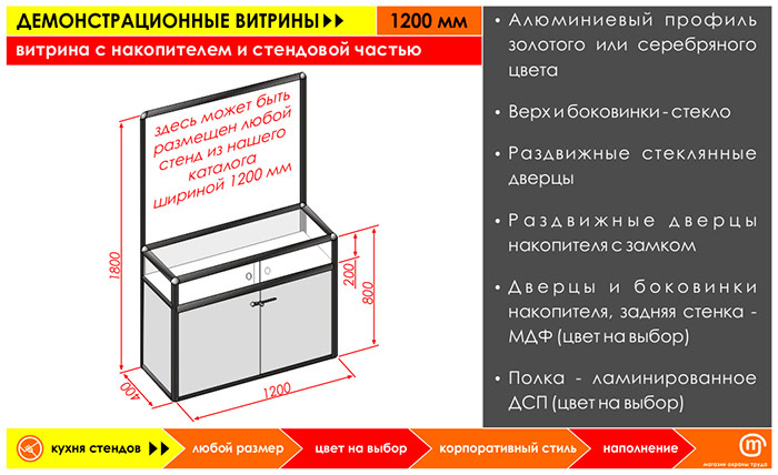 Любой стенд, представленный в нашем магазине, шириной 1200 мм. Возможно изготовление стендовой части на заказ
