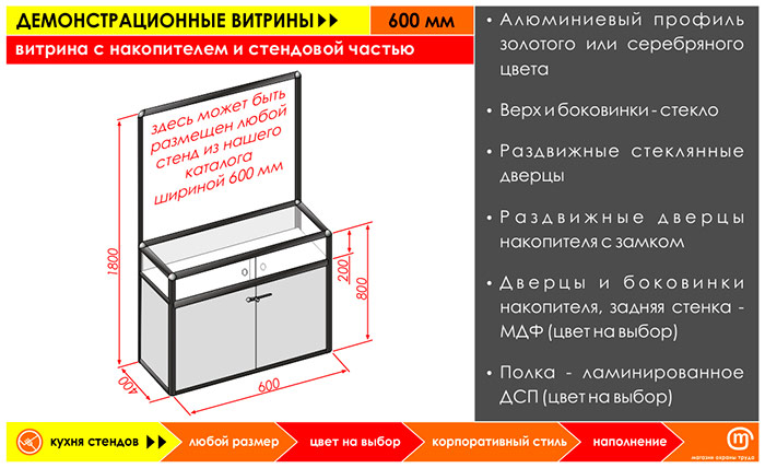 Любой стенд, представленный в нашем магазине, шириной 600 мм. Возможно изготовление стендовой части на заказ