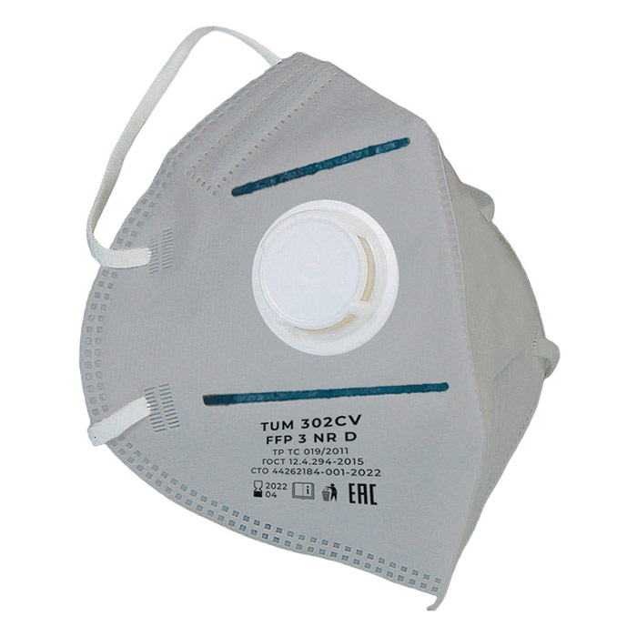 Респиратор противоаэрозольный TUM 302СV (FFP3) с клапаном и угольным слоем, к-т 10 шт – незаменимое средство индивидуальной защиты для тех, кто работает в условиях повышенной опасности для органов дыхания. Маска легко надевается и снимается, при этом обеспечивает надёжную защиту от пыли, различных вредных примесей и мелкодисперсных частиц в воздухе, а также вирусов. Благодаря особой конструкции с носовым зажимом и обтюратором, респиратор плотно прилегает к лицу, исключая попадание загрязнённого воздуха.