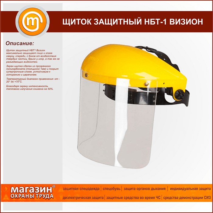 Щиток защитный НБТ1 Визион максимально защищает лицо и глаза сверху, спереди, с боков от воздействия твердых частиц, брызг и искр, а так же не разъедающих жидкостей