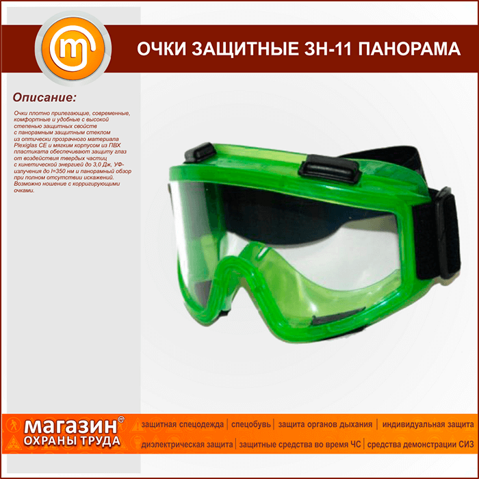Очки плотно прилегающие, современные, комфортные и удобные с высокой степенью защитных свойств с панорамным защитным стеклом из оптически прозрачного материала Plexiglas CE и мягким корпусом из ПВХ пластиката обеспечивают защиту глаз от воздействия твердых частиц с кинетической энергией до 3,0 Дж, УФ-излучения до l=350 нм и панорамный обзор при полном отсутствии искажений. Возможно ношение с корригирующими очками