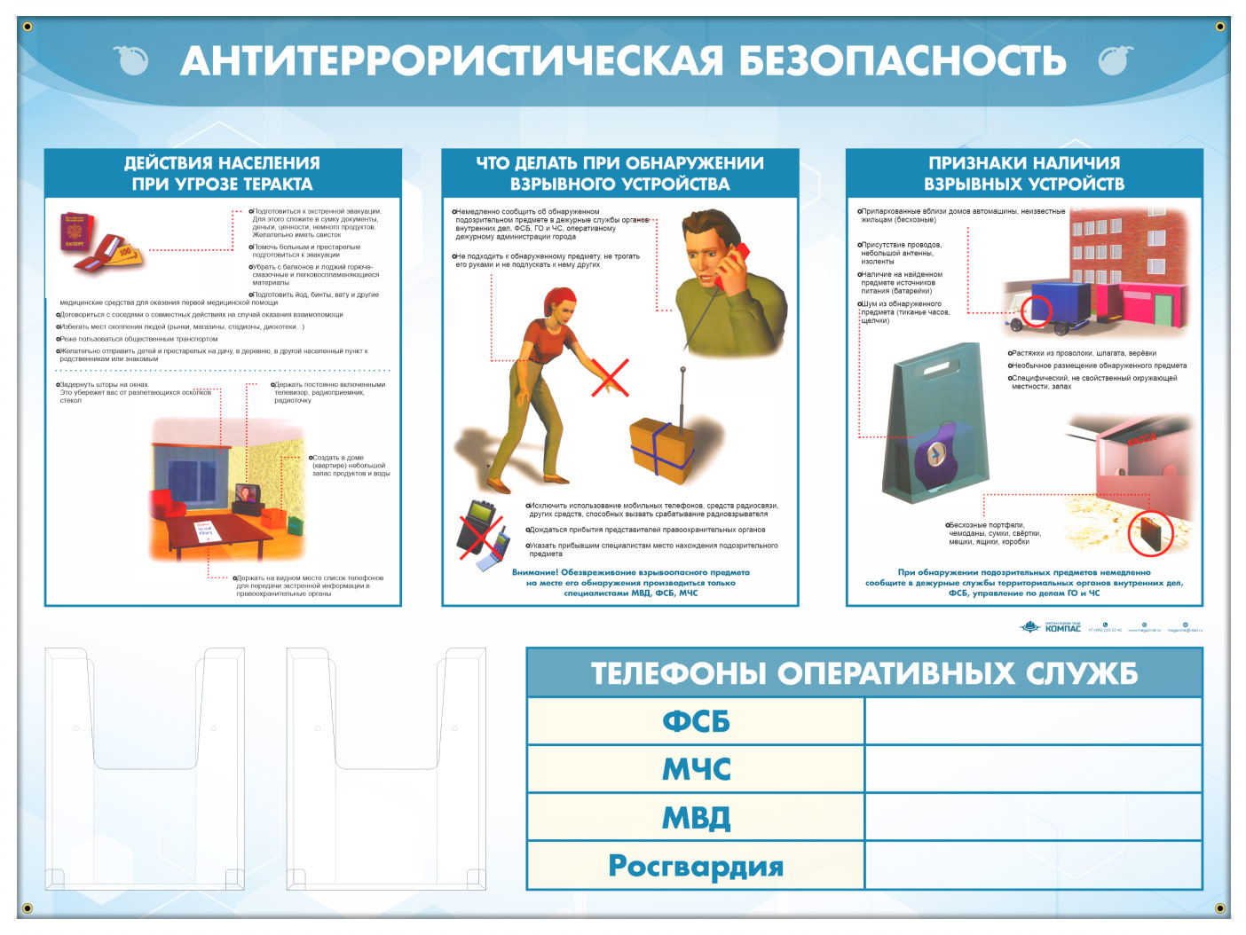 Стенд «Антитеррористическая безопасность» с 2-мя глубокими А5 карманами - это важнейшая информация о необходимых действиях по выявлению готовящегося теракта и о том, как себя вести в случае террористического акта