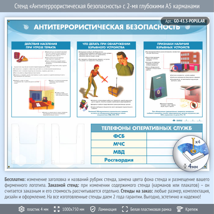 Стенд «Антитеррористическая безопасность» с 2-мя глубокими А5 карманами (GO-43.3)