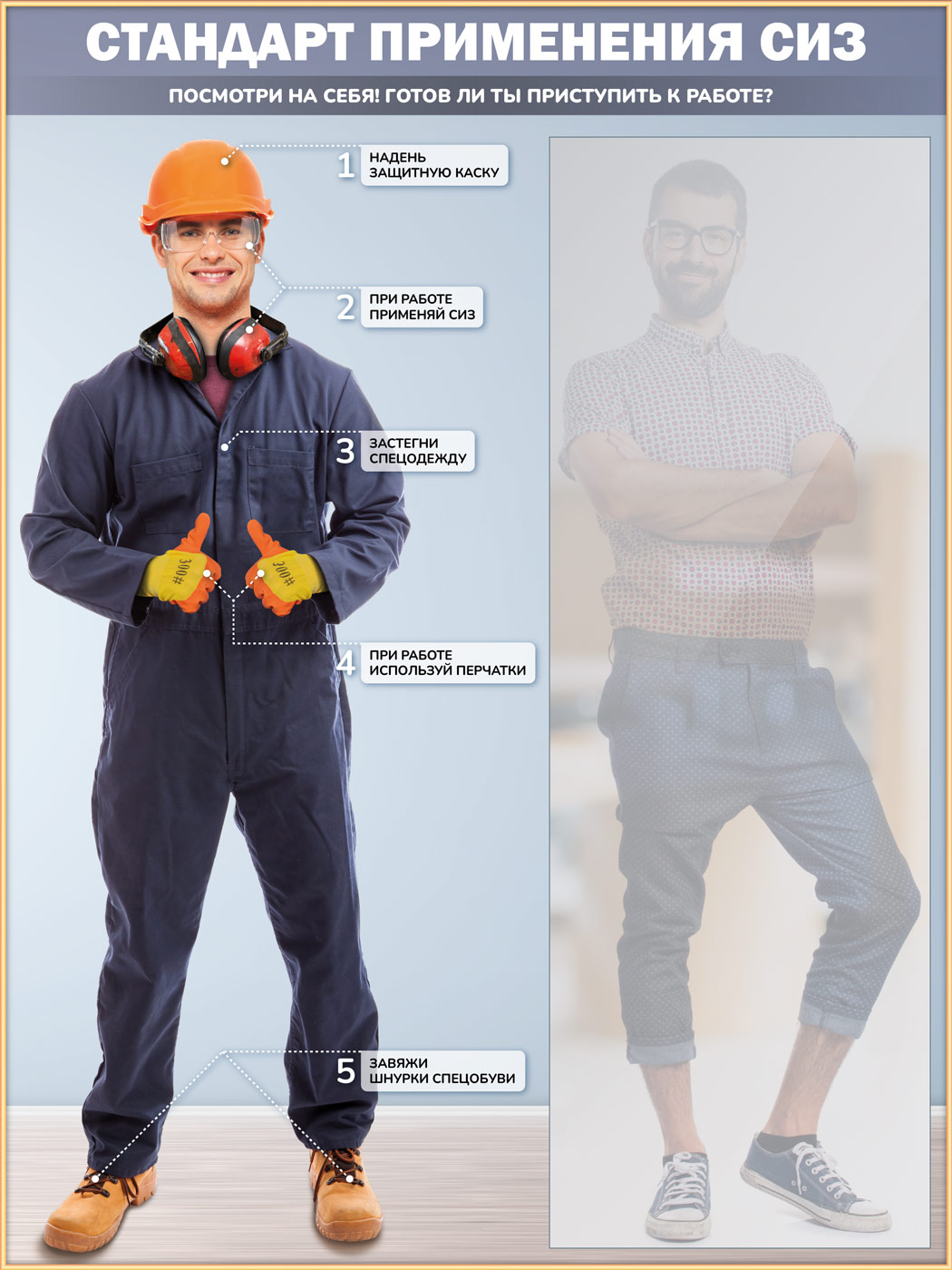 Стенд для демонстрации применения СИЗ с зеркалом, 1500х2000 мм (СПС-01). Стенды с примером необходимой спецодежды и комплекта СИЗ укомплектованные зеркалом - отличное решение, позволяющее работнику быстро оценить свой вид на предмет соответствия требованиям безопасной работы в цехе, на стройплощадке и др. местах