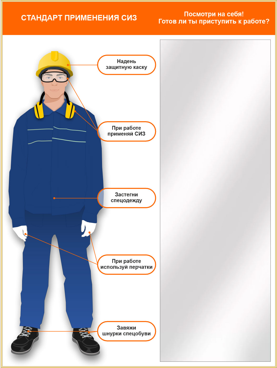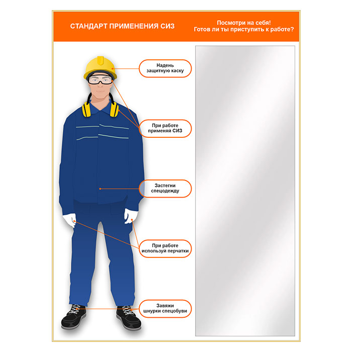 Стенд для демонстрации применения СИЗ с зеркалом, 1500х2000 мм (СПС-01.2). Стенды с примером необходимой спецодежды и комплекта СИЗ укомплектованные зеркалом - отличное решение, позволяющее работнику быстро оценить свой вид на предмет соответствия требованиям безопасной работы в цехе, на стройплощадке и др. местах