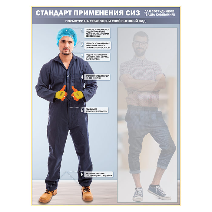 К бесплатным изменениям относятся изменение названия, шрифта и цвета заголовков, изменение текста пунктов и их шрифта, замена фона на однотонный или градиентный, а также размещение фирменного логотипа. Если же на стенде нужно использовать другого персонажа с другим комплектом спецодежды - то цена увеличивается на 4'900₽ за макет