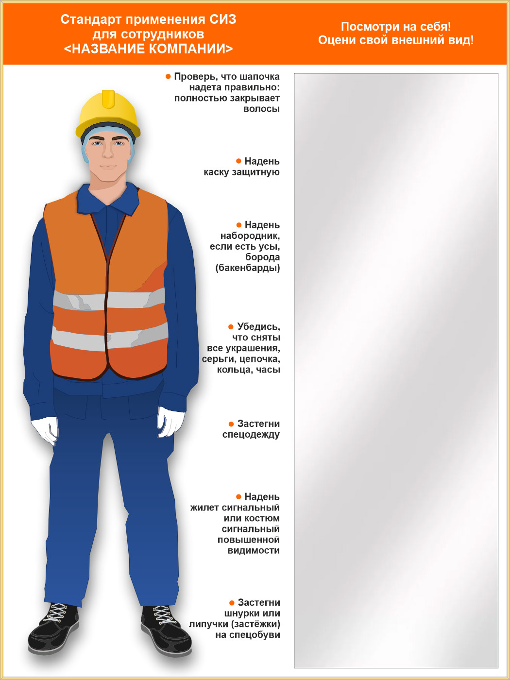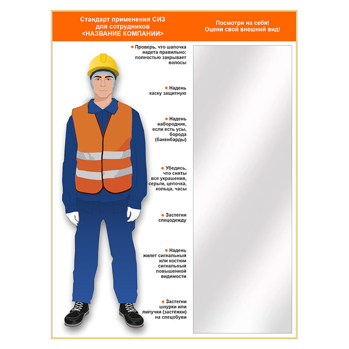 Стенд для демонстрации применения СИЗ с зеркалом, 1500х2000 мм (СПС-02.2). Стенды с примером необходимой спецодежды и комплекта СИЗ укомплектованные зеркалом - отличное решение, позволяющее работнику быстро оценить свой вид на предмет соответствия требованиям безопасной работы в цехе, на стройплощадке и др. местах