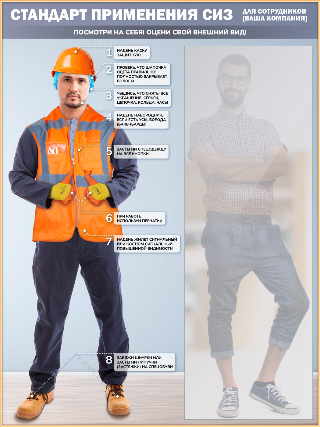 К бесплатным изменениям относятся изменение названия, шрифта и цвета заголовков, изменение текста пунктов и их шрифта, замена фона на однотонный или градиентный, а также размещение фирменного логотипа. Если же на стенде нужно использовать другого персонажа с другим комплектом спецодежды - то цена увеличивается на 4'900₽ за макет