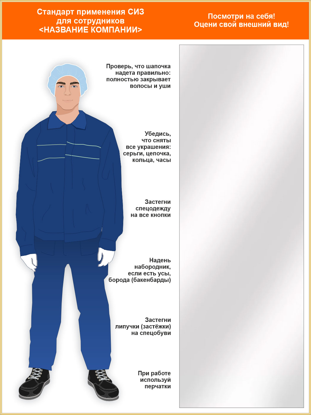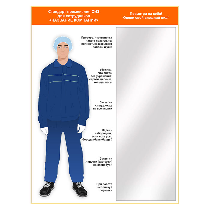 Стенд для демонстрации применения СИЗ с зеркалом, 1500х2000 мм (СПС-03.2). Стенды с примером необходимой спецодежды и комплекта СИЗ укомплектованные зеркалом - отличное решение, позволяющее работнику быстро оценить свой вид на предмет соответствия требованиям безопасной работы в цехе, на стройплощадке и др. местах