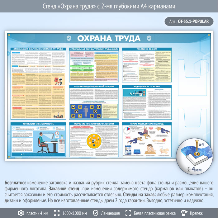 Стенд «Охрана труда» с 2-мя глубокими А4 карманами содержит общую информацию об охране труда