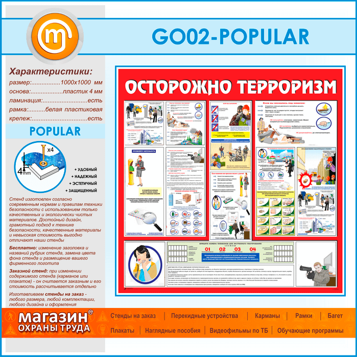 Стенд осторожно терроризм ярко проиллюстрирован, что позволит лучше запомнить о том, как надо себя вести, если Вы оказались в заложниках и что делать, если произошел взрыв, как вести себя в ситуациях, когда позвонили или прислали письмо с угрозой теракта, что делать, если взрыв всё-таки произошел…