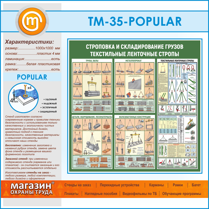 Стенд «Строповка и складирование грузов. Текстильные ленточные стропы» (TM-35)