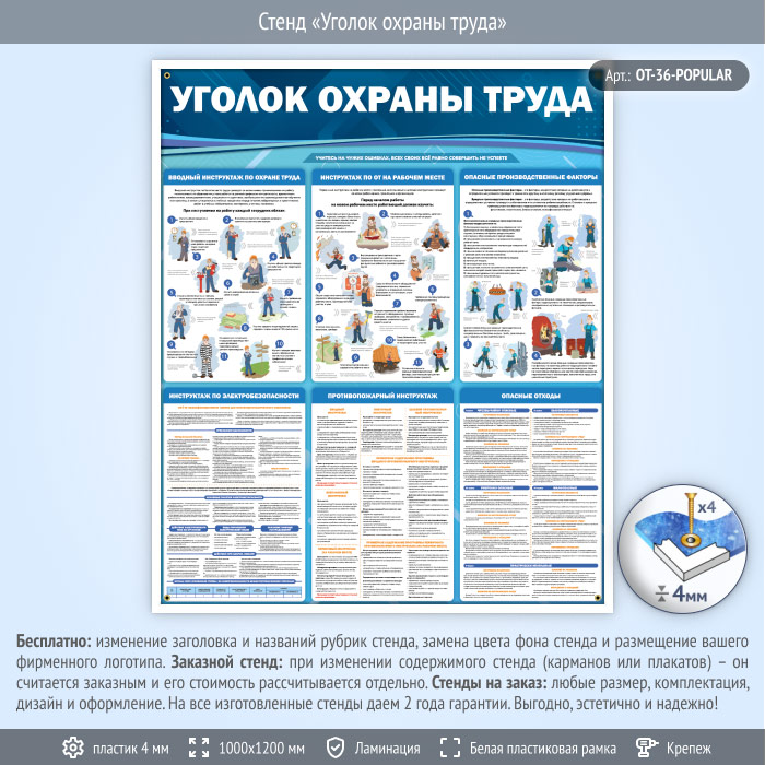 Стенд «Уголок охраны труда» (OT-36) содержит вводный инструктаж по ОТ, инструктаж по ОТ на рабочем месте, информацию об опасных производственных факторах, об опасных отходах, а также инструктажи по электробезопасности и по пожарной безопасности.