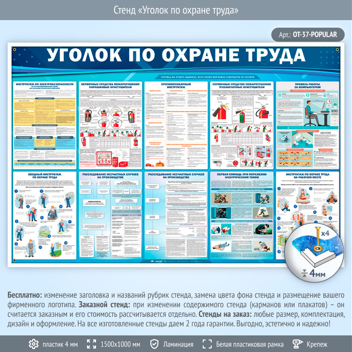 Стенд «Уголок по охране труда» (OT-37) содержит самую важную информацию по охране труда.
