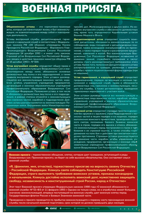 Стенд «Военная присяга» (VU-06) содержит текст военной присяги, а также общевойсковые уставы (устав внутренней службы, дисциплинарный устав, устав гарнизонной и караульной службы, строевой устав).