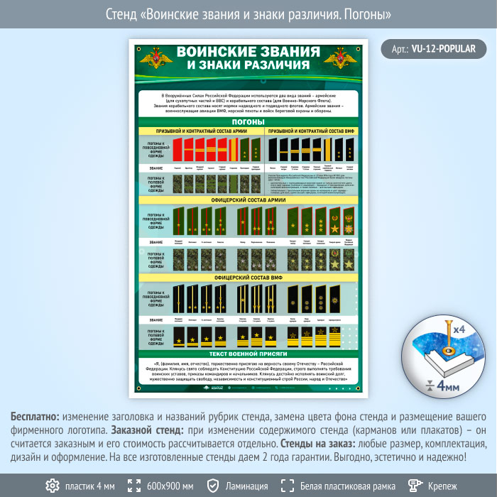 Стенд «Воинские звания и знаки различия. Погоны» (VU-12)