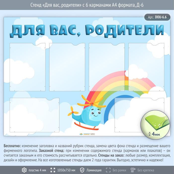 Стенд «Для вас, родители» с 6 карманами А4 формата (DOU-6.6)
