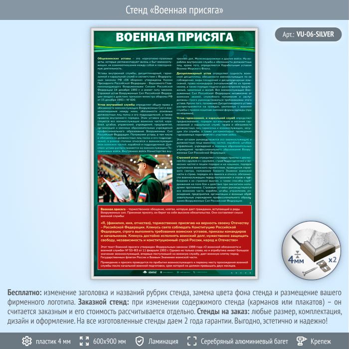 Стенд «Военная присяга» (VU-06) содержит текст военной присяги, а также общевойсковые уставы (устав внутренней службы, дисциплинарный устав, устав гарнизонной и караульной службы, строевой устав).