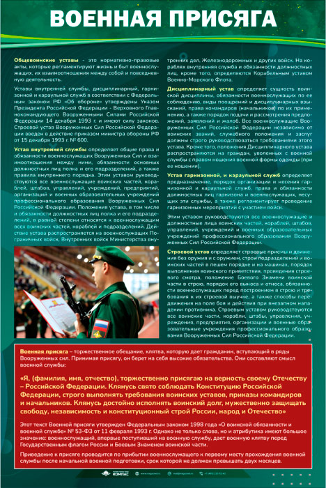 Стенд «Военная присяга» (VU-06) содержит текст военной присяги, а также общевойсковые уставы (устав внутренней службы, дисциплинарный устав, устав гарнизонной и караульной службы, строевой устав).