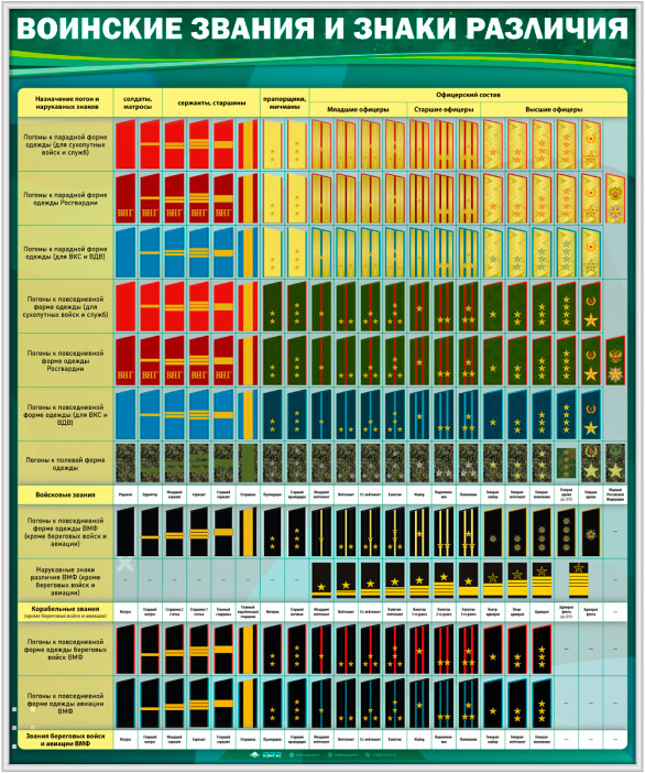 Стенд «Воинские звания и знаки различия» (VU-11) содержит таблицу воинских званий и знаков различия.