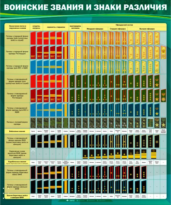 Стенд «Воинские звания и знаки различия» (VU-11) содержит таблицу воинских званий и знаков различия.