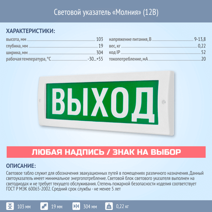ВНИМАНИЕ! Изготавливаем любую надпись или знак на выбор. Светодиодный указатель закрепляется к стене при помощи 2 шурупов (диаметром не более 3,5 мм). Степень защиты оболочки оповещателя (код IP) - 52, средний срок службы - не менее 5 лет. Степень пожарной безопасности изделия соответствует ГОСТ Р МЭК 60065-2002