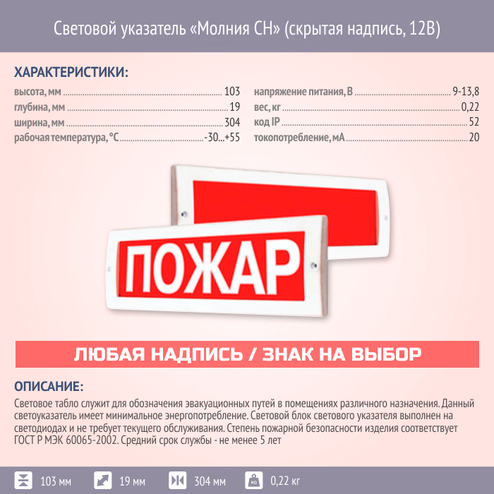 Плоское световое табло Молния СН (скрытая надпись, 12В) со скрытой надписью служит для обозначения эвакуационных путей в помещениях различного назначения. Табло имеет скрытую надпись, не видимую в обычном дежурном режиме. В режиме тревоги - надпись становится видимой. Световой блок светоуказателя выполнен на светодиодах и не требует текущего обслуживания. Конструкция светового указателя дает возможность менять надпись