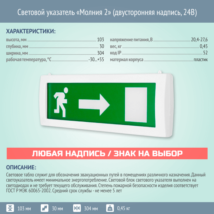ВНИМАНИЕ! Изготавливаем любую надпись или знак на выбор. Светодиодный указатель закрепляется к стене при помощи 2 шурупов (диаметром не более 3,5 мм). Степень защиты оболочки оповещателя (код IP) - 52, средний срок службы - не менее 5 лет. Степень пожарной безопасности изделия соответствует ГОСТ Р МЭК 60065-2002