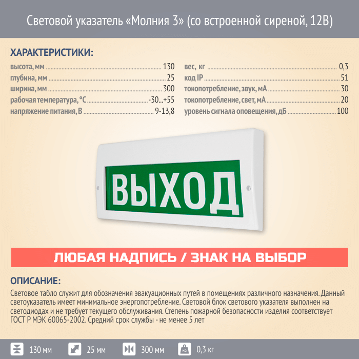 Световое табло Молния 3 (12В) со встроенной сиреной 100 дБ служит для обозначения эвакуационных путей в помещениях различного назначения. Световой блок светоуказателя выполнен на светодиодах и не требует текущего обслуживания. Конструкция светового указателя дает возможность менять надпись