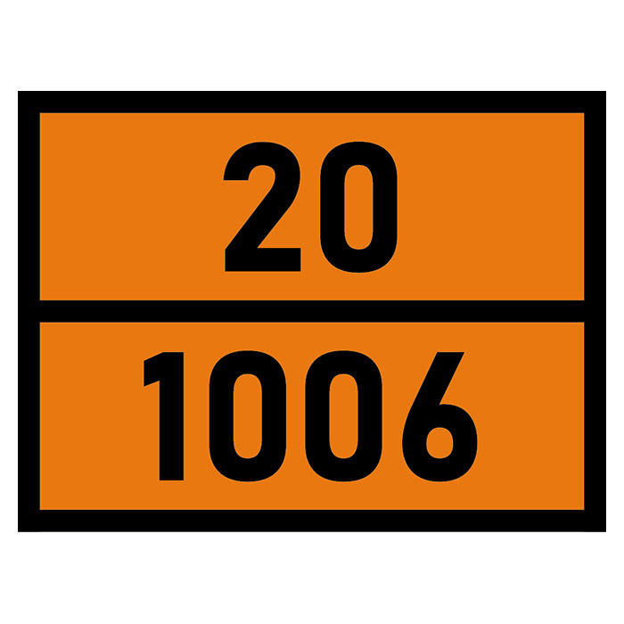 Табличка «Опасный груз 20-1006», Аргон сжатый – знак опасности оранжевого цвета с идентификационным номером, определенным ООН и указывающим на класс и вид вещества. Устанавливается на транспортное средство с целью информирования и обеспечения безопасности при перевозке опасных грузов. На автомобиле должно быть установлено две таблички: одна спереди, вторая сзади.