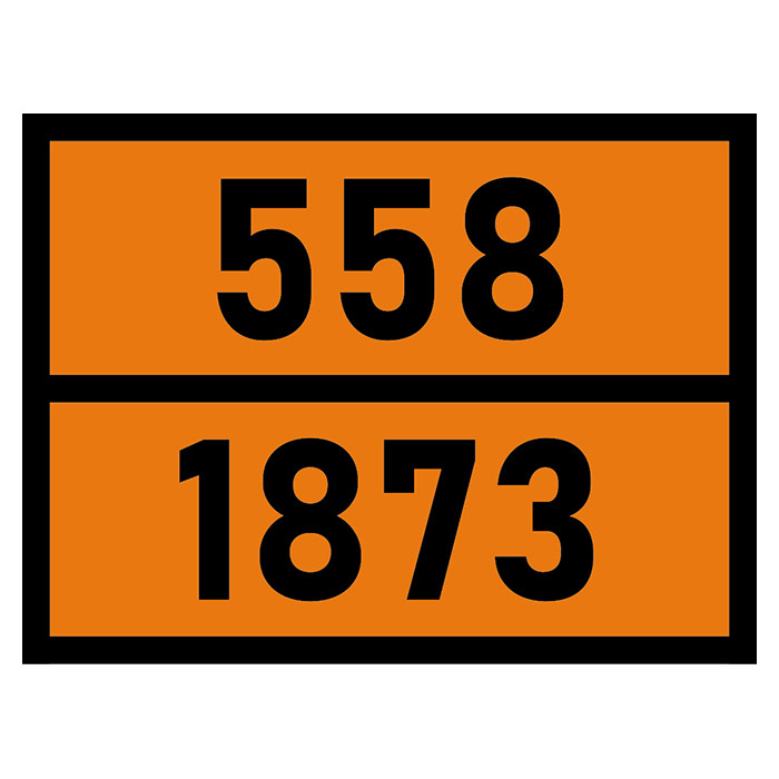 Табличка «Опасный груз 558-1873», Кислота хлорная – знак опасности оранжевого цвета с идентификационным номером, определенным ООН и указывающим на класс и вид вещества. Устанавливается на транспортное средство с целью информирования и обеспечения безопасности при перевозке опасных грузов. На автомобиле должно быть установлено две таблички: одна спереди, вторая сзади.